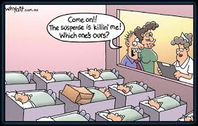 Seorang jururawat keluar dari bilik pembedahan lalu berkata kepada lelaki yang pertama, “Tahniah! Isteri Tuan selamat melahirkan anak kembar dua.” “Kembar dua! Kebetulan pula, saya bekerja di menara berkembar Petronas,” kata lelaki yang pertama dengan riangnya.